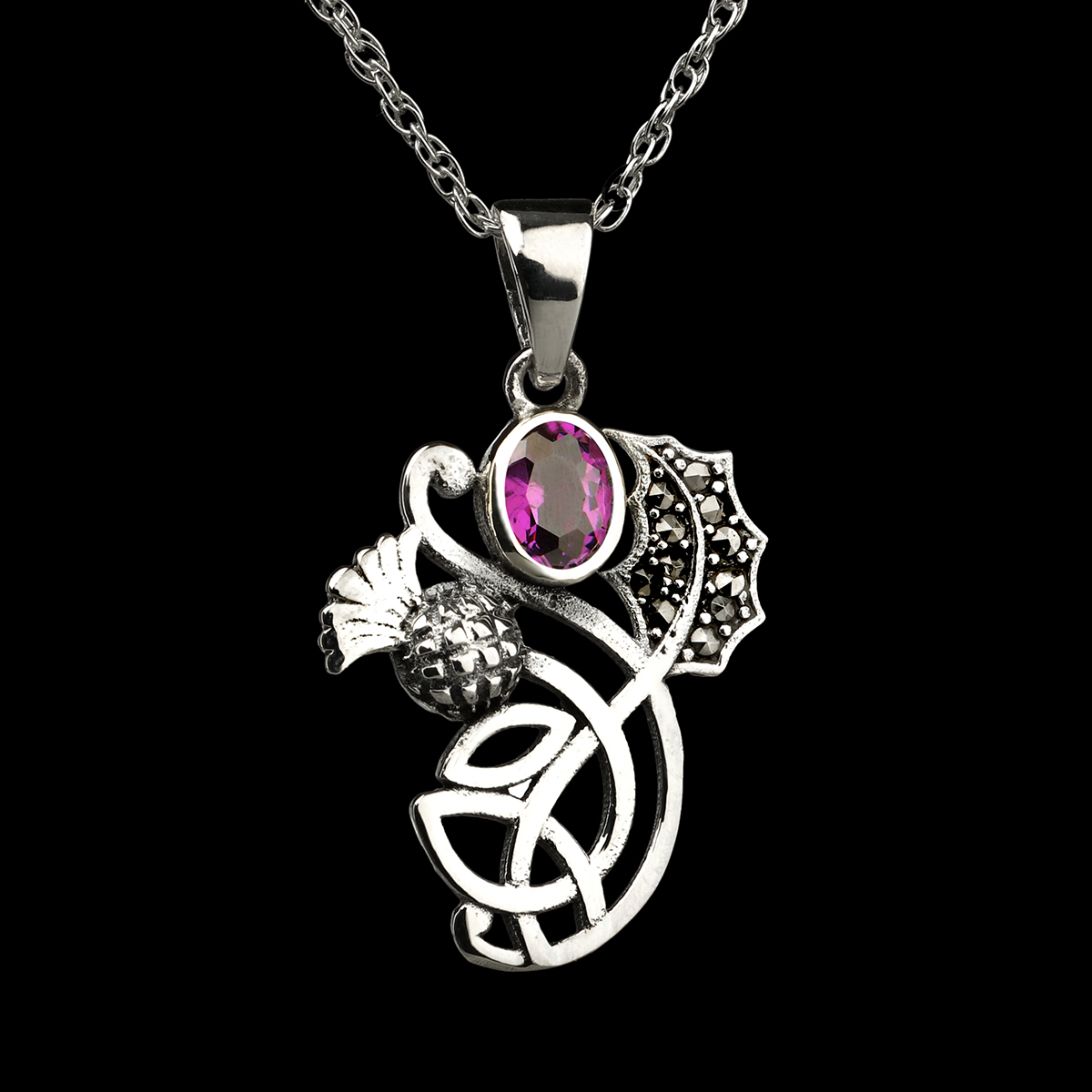 Offen gearbeitete Kette aus Schottland mit der berühmten schottischen Distel & keltischen Ornamenten. Liebevoll verziert mit glitzerndem Markasit und einem Kristall in Amethystfarbe. Maße Anhänger: 25 mm x 15 Länge der Kette: 45 cm Material: 925er SterlingsilberHandgefertigt in Schottland Die Lieferung erfolgt in einer hübschen Schmuckschatulle. Die passenden Ohrhänger haben wir auch im Angebot. Die Distel ist Schottlands Nationalsymbol. Der Legende nach rettete eine Distel einst einer Gruppe schlafender schottischer Krieger das Leben, da ein dänischer Angreifer barfuß auf eine Distel trat und durch seinen Schmerzensschrei die Schotten aufweckte. Vom Schrei gewarnt, schlugen die Verteidiger daraufhin die Barbaren in die Flucht. Seither gilt die Distel als Schutzpflanze und wurde später sogar in das königlich schottische Wappen aufgenommen.