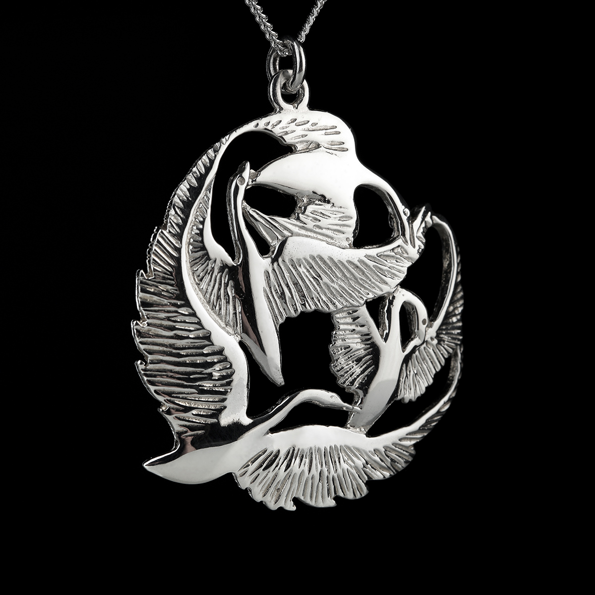Handgefertigte Children of Lir Kette aus IrlandDiese kunstvoll gestaltete Kette zeigt die vier Kinder Lirs im Flug, die in der bekannten irischen Legende in Schwäne verwandelt wurden. Diese kunstvoll gestaltete Kette zeigt die vier Kinder Lirs im Flug, die in der bekannten irischen Legende in Schwäne verwandelt wurden. Die feine Verarbeitung und die fließende Form des Anhängers verleihen dem Schmuckstück eine besondere Ausdruckskraft. Handgefertigt in Irland trägt es die Symbolik von Liebe, Zusammenhalt und Mythologie in sich. Material 925er Sterlingsilber Durchmesser des Anhängers ca. 37 mm Kettenlänge ca. 45 cm Sorgfältige Handfertigung in Irland Lieferung in Schmuckbox Die Geschichte der Children of Lir erzählt von vier Königskindern, die durch einen Zauber in Schwäne verwandelt wurden und über Jahrhunderte an irische Gewässer gebunden waren. Diese Erzählung ist bis heute ein Sinnbild für Treue, Verlust und die Kraft der Liebe und zählt zum festen Bestandteil des irischen Kulturerbes.