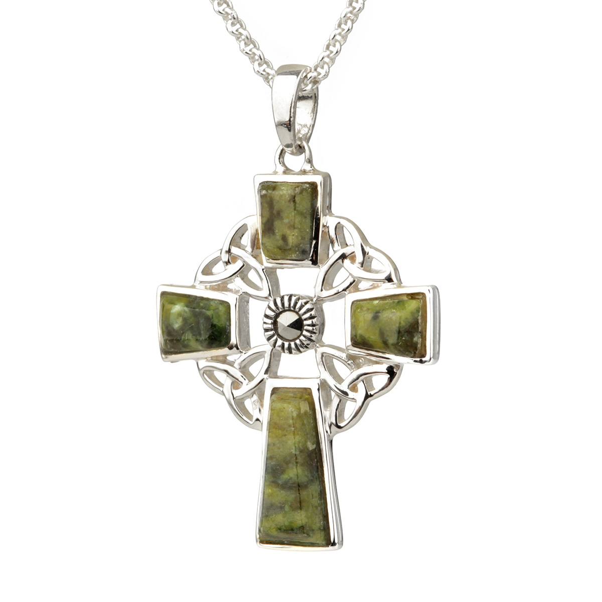Keltisches Kreuz mit Connemara Marmor & Markasit – 925 Silber aus Irland Dieses keltische Kreuz vereint irische Symbolkraft mit edlen Materialien: Handgefertigt aus 925er Sterling Silber, verziert mit echtem Connemara Marmor aus der Grafschaft Galway und einem facettierten Markasit im Zentrum. Der grüne Marmor ist ein seltener Naturstein, der ausschließlich an Irlands Westküste abgebaut wird. Das Kreuz zeigt typische keltische Merkmale wie das Radmotiv und knotige Ornamente – inspiriert von historischen Hochkreuzen, die im frühen Mittelalter an heiligen Orten errichtet wurden. Größe des Anhängers: ca. 28 x 21 mm Kettenlänge: ca. 45 cm Material: 925er Sterling Silber, Connemara Marmor, Markasit Handgefertigt in Irland Lieferung in Geschenkbox