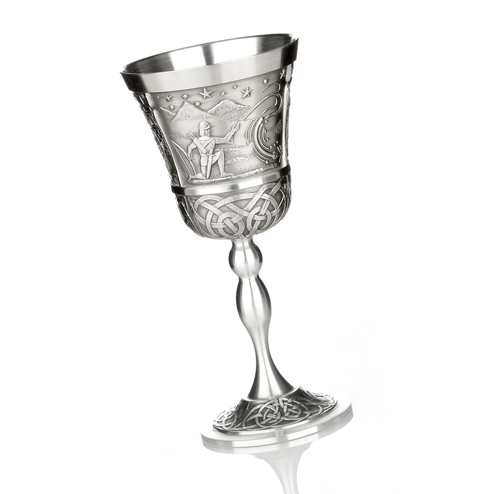 Handgefertigter Weinkelch aus Irland - zu Ehren von Na FiannaDer aufwendig und sehr liebevoll gefertigte Zinnkelch zeigt drei verschiedene Szenen aus dem Leben der Fianna und ist rundherum mit keltischen Mustern verziert. Im Fuß befinden sich die Touchmarks des Herstellers aus Irland. Höhe: ca. 17,5 cm Inhalt: ca. 200 ml Gewicht: ca. 265 gMaterial: Polierter Hartzinn (Pewter) Nach traditionellen Methoden handgefertigt in Irland Na Fianna war eine mächtige Gruppe von Helden und Kriegern, die im 12. Jahrhundert zum Schutz des Hochkönigs von Irland und des Königreichs gegründet wurde. Sie lebten abseits der übrigen gälischen Gesellschaft und verschrieben ihr Leben gänzlich dem Schutz ihres Landes und dem Kampf gegen Unterdrückung und Unrecht.Sie waren berühmt für ihre Großzügigkeit und setzten sich oft für die Schwächsten und am wenigsten Mächtigen in der Gesellschaft ein.
