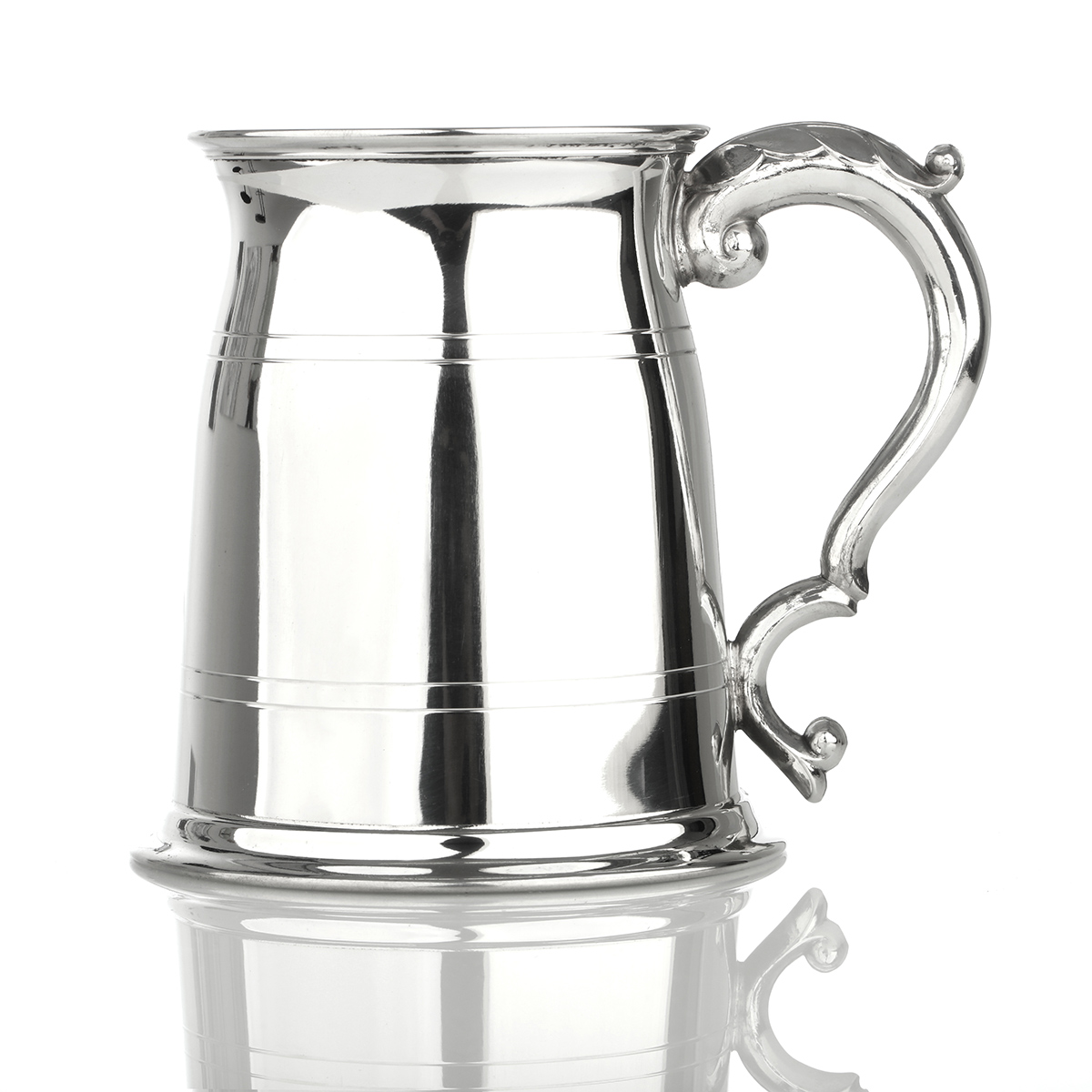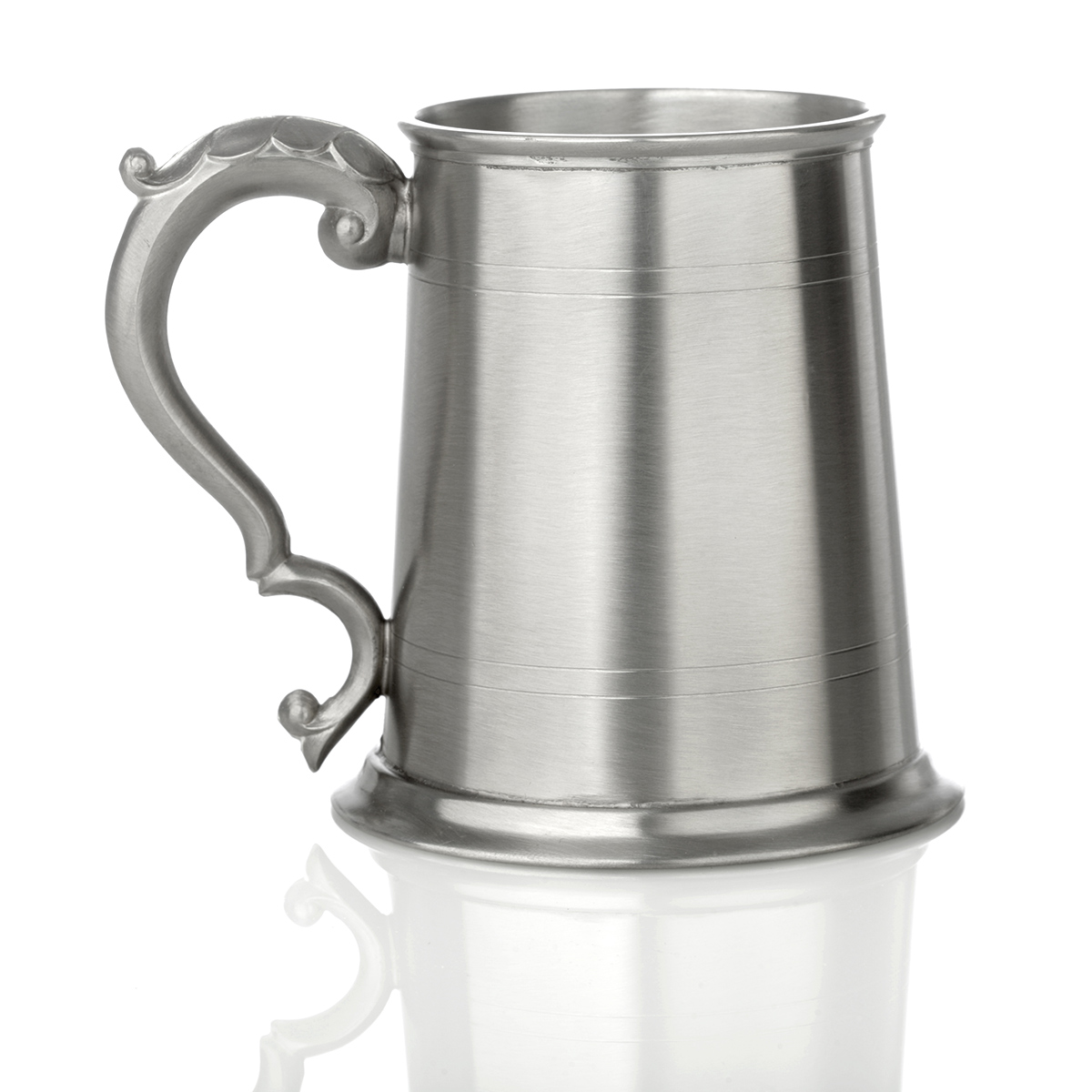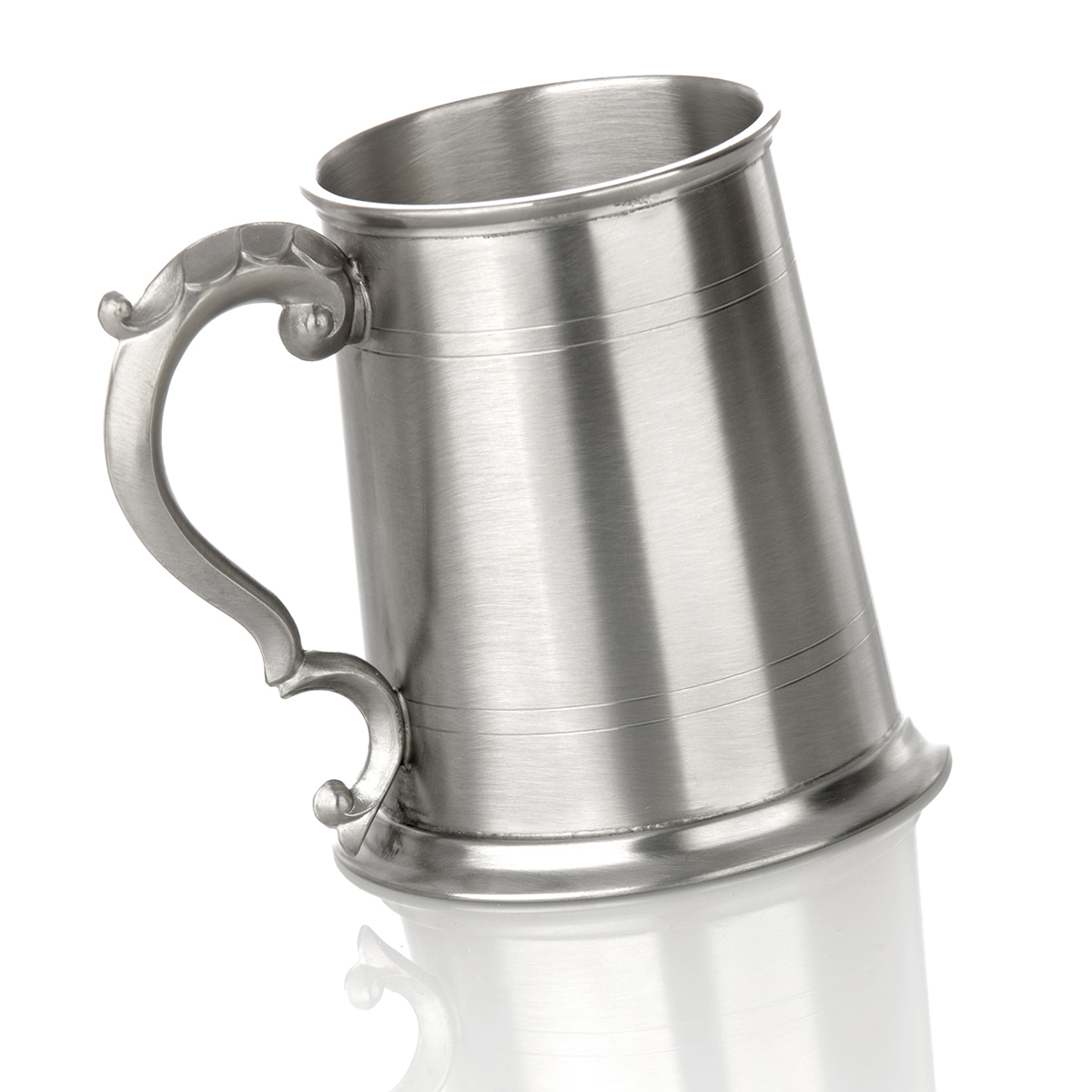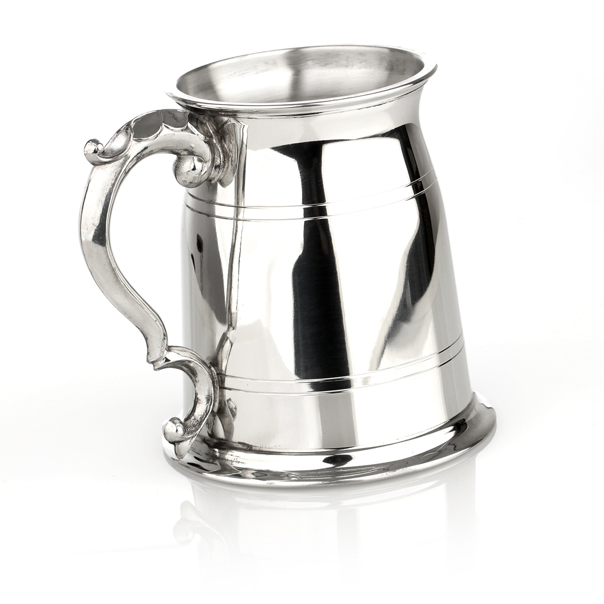 Handgefertigter 1 Pint Bierkrug im georgianischen StilDer Bierkrug im georgianischen Stil bringt den Charme des 18. Jahrhunderts direkt zu dir nach Hause. Handgefertigt in England nach traditionellen Techniken, zeigt er sich mit einem kunstvoll verschnörkelten Griff, der typisch für diese Epoche ist.Aus poliertem Zinn gefertigt, strahlt der Krug eine authentische Optik aus, die an die Handwerkskunst vergangener Zeiten erinnert. Durch die handwerkliche Herstellung gleicht kein Krug dem anderen – kleine Unterschiede machen jedes Exemplar besonders. Inhalt: ca. 1 englischer Pint (568 ml) Höhe: ca. 125 mm Durchmesser am Boden: ca. 115 mm Durchmesser am oberen Rand: ca. 90 mm Gewicht: ca. 260 g Material: Polierter Zinn (Pewter) Nach traditionellen Methoden handgefertigt in England