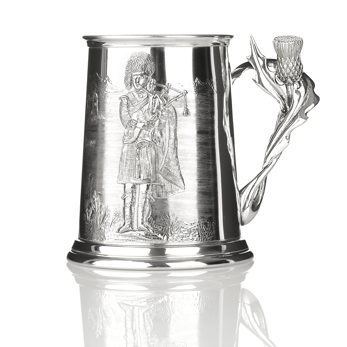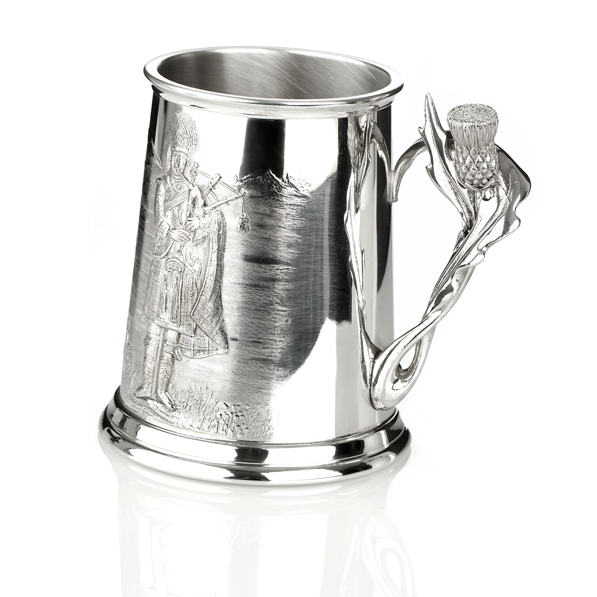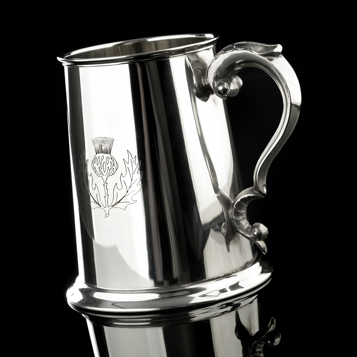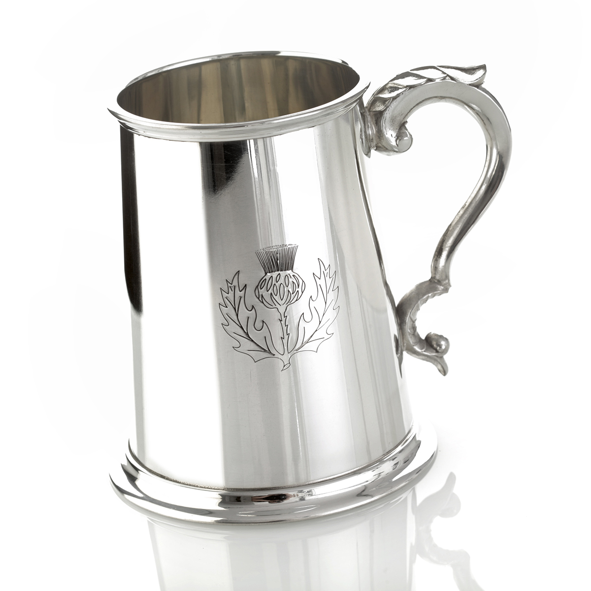 Die schottische Distel - Das Nationalsymbol von SchottlandPolierter 1 Pint Bierkrug aus Zinn mit Gravur Inhalt: ca. 1 englischer Pint (568 ml)Höhe: ca. 125 mmDurchmesser am Boden: ca. 115 mmDurchmesser am oberen Rand: ca. 90 mmGewicht: ca. 270 gMaterial: Polierter Hartzinn (bleifrei) Handgefertigt in EnglandIm Boden sind die Touchmarks des Herstellers eingeprägt Die Herstellung erfolgt nach traditionellen Methoden unter den Vorgaben der 'Assosciation of British Pewter Craftsman' Die schottische Distel ist Schottlands Nationalsymbol.Der Legende nach rettete die Distel einmal ein paar schlafenden schottischen Kriegern das Leben,da ein dänischer Angreifer Barfuß auf eine Distel trat und durch seinen Schrei die Schotten weckte.Diese schlugen daraufhin die Barbaren in die Flucht.Seither gilt die Distel als Schutzpflanze und wurde später sogar in das königlich schottische Wappen aufgenommen.