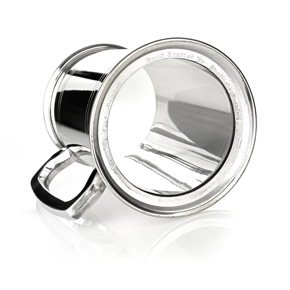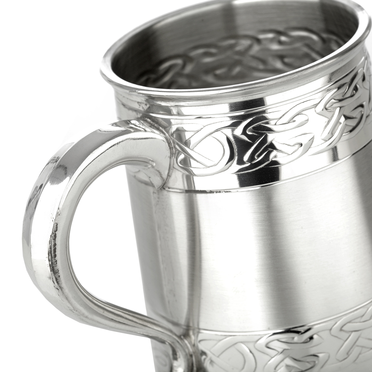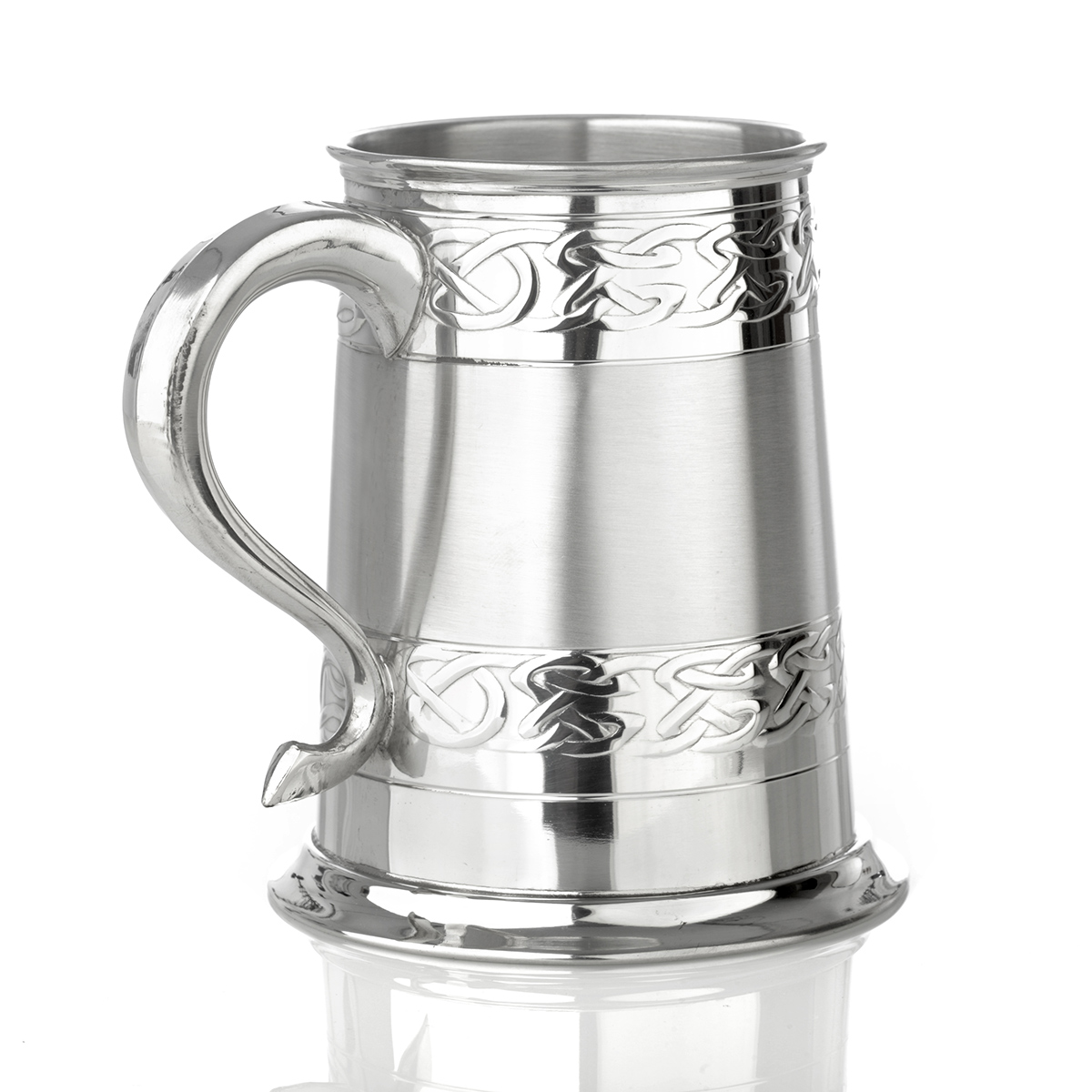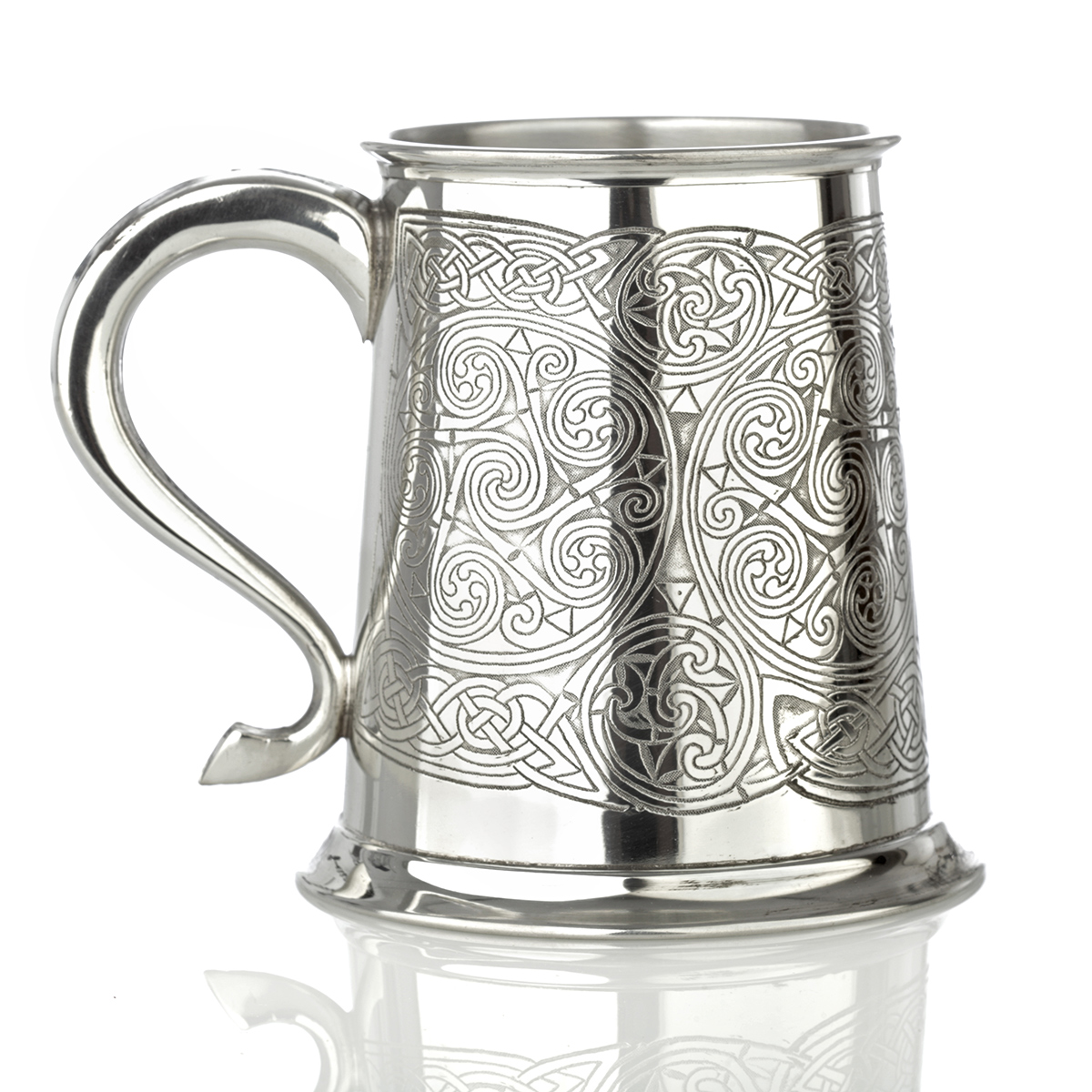 Englischer 1 Pint Bierkrug aus Zinn mit keltischen MusternDieser englische 1 Pint Bierkrug aus Zinn ist aufwendig in Handarbeit mit keltischen Spiralen und Mustern verziert, inspiriert vom berühmten Book of Kells. Das Design orientiert sich an traditionellen keltischen Mustern und verleiht dem Krug einen besonderen Charakter. Er ist lebensmittelecht und schadstofffrei, gefertigt nach den Vorgaben der "Association of British Pewter Craftsman" Inhalt: ca. 1 englischer Pint (568 ml) Höhe: ca. 125 mm Durchmesser am Boden: ca. 115 mm Durchmesser am oberen Rand: ca. 90 mm Gewicht: ca. 270 g Material: Polierter Zinn (Pewter) Handgefertigt in England
