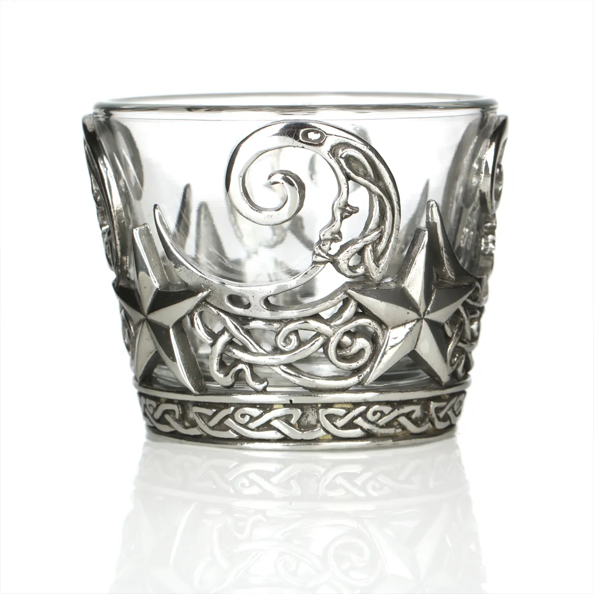 Keltisches Teelichtglas Ein märchenhaft verschlafenes Teelichtglas für entspannte Abende. Das Glas ist eingefasst in handgefertigte keltische Ornamente mit Monden und Sternen aus poliertem Hartzinn, welche in feiner Handarbeit in England hergestellt werden. Die viele liebevollen Details und die außerordentlich hochwertige Verarbeitung machen das Glas zu einem echten Lieblingsstück. Durchmesser: 8 cm Höhe: 6,5 cm Material: Glas und polierter Hartzinn (Pewter) Handgefertigt in England Geeignet für die meisten Teelichter und Votivkerzen Die Entstehung der keltischen Knoten führen viele Wissenschaftler darauf zurück, dass der ursprüngliche keltische Glaube untersagte, realistische Abbildungen von Lebewesen zu zeichnen, weil dies ihre Seele stören würde. Populär wurden die keltischen Knoten ab ca. 450 n. Chr., als der Einfluss des Christentums auf die Kelten größer wurde. Die komplexen Muster kamen in Mode und wurden nun gern zur Verzierung von Schriften und Büchern verwendet. In diesem Zeitraum entstanden auch die ersten Zoomorphics, die Verflechtung von Tiermotiven mit keltischen Knoten. Ob die ursprünglichen keltischen Muster eine Bedeutung haben oder nur zur Verzierung dienten, werden wir wahrscheinlich kaum noch herausfinden können, da es aus dieser Zeit keine Aufzeichnungen der Kelten gibt. Keltische Knoten sind immer geflochten, ohne Anfang und ohne Ende. Die komplexen Muster der frühen Kelten waren so unglaublich fein und detailreich gearbeitet, dass manche sie später als das "Werk der Engel" bezeichneten.