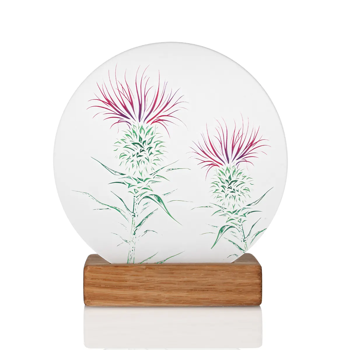 Scottish Thistle Teelichthalter aus recyceltem Whiskyfass Dieser wunderschöne Teelichthalter aus der Moments-Kollektion von LT Creations zeigt ein farbenfrohes Design einer schottischen Distel. Der handgefertigte Eichensockel ist aus einem wiederverwendeten schottischen Whiskyfass gefertigt und verleiht dem Teelichthalter einen einzigartigen Charme. Das Holz ist naturbelassen. Das farbenfrohe Design der Distel ist in liebevoller Handarbeit ausgeführt und bringt einen Hauch von Schottland in Dein Zuhause. Die stabile Scheibe aus mattem Echtglas streut das Licht und erzeugt einen schön warmen Schein. Produktabmessungen (ca.): Höhe: 13cm x Breite: 13cm x Tiefe: 8cm Material Sockel: Eichenholz Scheibe: Echtglas, matt gestrahlt