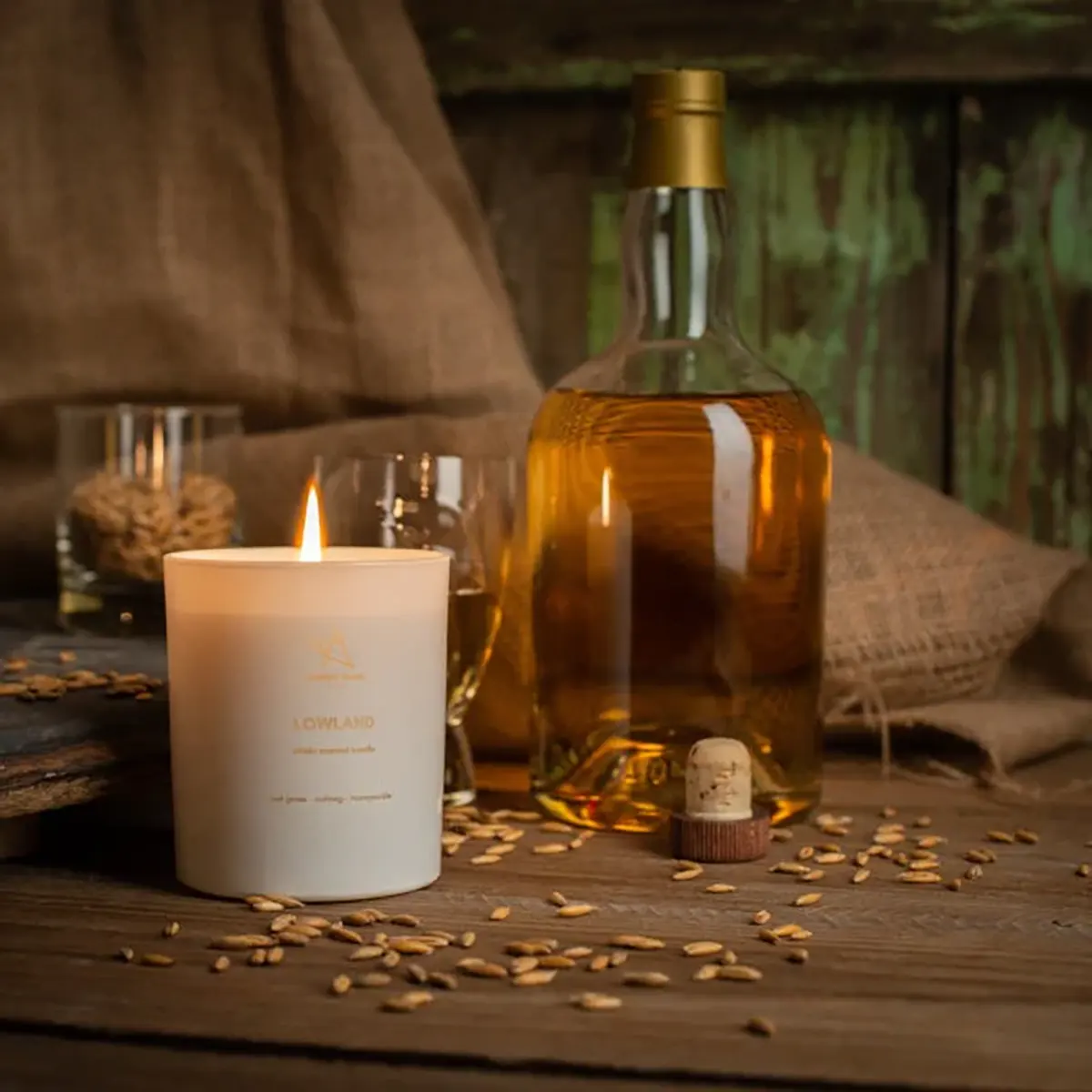Lowland Whisky Duftkerze aus SchottlandBring den Duft der bekanntesten Whisky-Regionen Schottlands in dein Zuhause. Diese hochwertigen Duftkerzen werden in Schottland von Hand gegossen und bestehen aus 100 % pflanzlichem Sojawachs. Jede Variante greift Aromen auf, die typisch für die jeweilige Whisky-Region sind – von torfig und salzig bis fruchtig und würzig. Inhalt: 250 ml Maße: 90 x 80 mm Brenndauer: ca. 45 Stunden Material: 100 % Sojawachs Scotch Whisky: Heidekraut, Zedernholz, Moos Speyside (Grün): Apfel, Birne, Zimt Highland (Rot): Heidekraut, Obstkuchen, Apfel Lowland (Weiß): Frisches Gras, Muskatnuss, Geißblatt Islay (Blau): Torf, Eiche, Waldblumen Campbeltown (Schwarz): Meersalz, Holzrauch