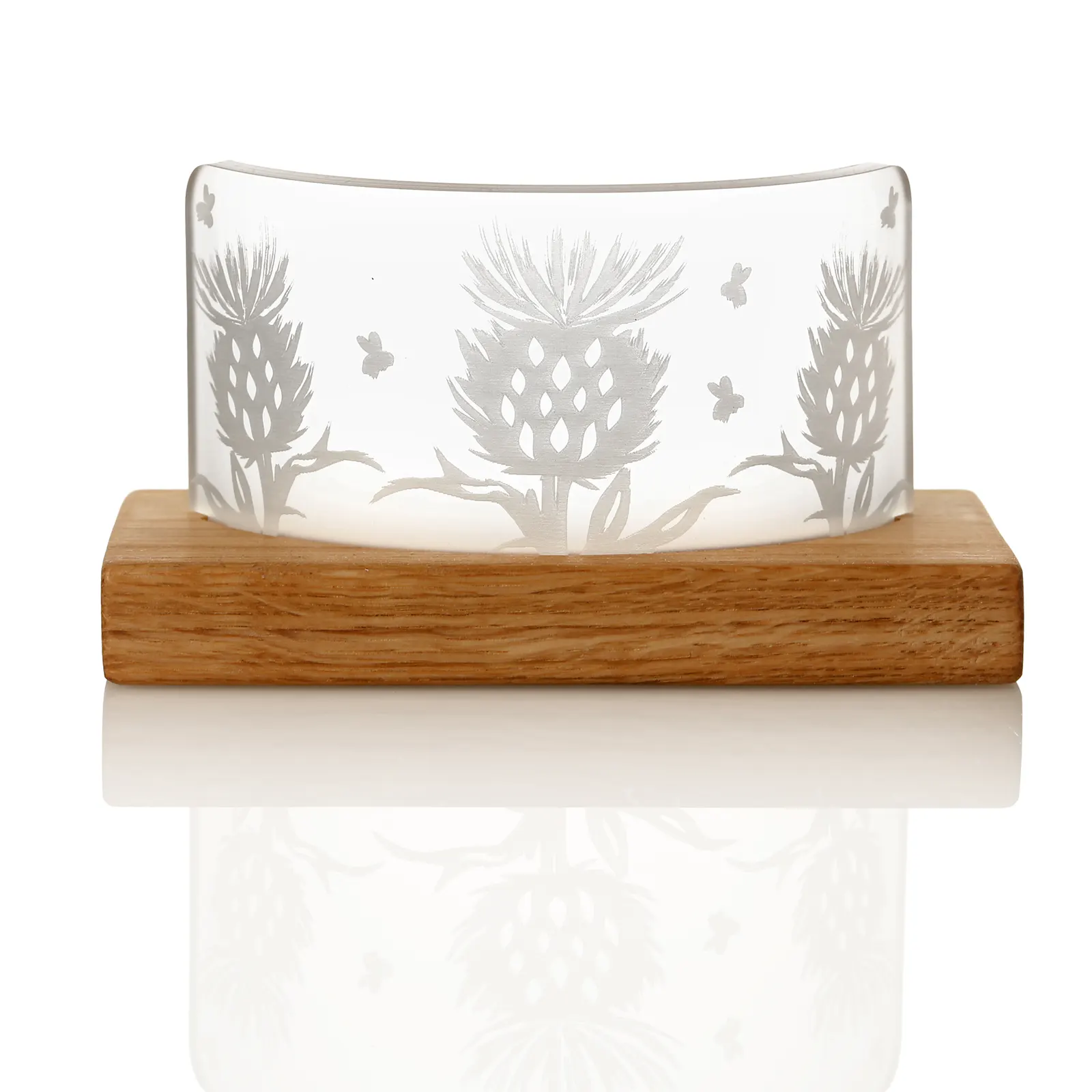 Bees & Thistles Teelichthalter aus recyceltem WhiskyfassEin wunderschöner Teelichthalter aus der Crescent-Kollektion von LT Creations mit gravierten schottischen Disteln, umschwirrt von Bienen. Der einzigartige Eichensockel wird aus einem wiederverwendeten schottischen Whiskyfass gefertigt. Das naturbelassene Holz verleiht jedem Teelichthalter seinen ganz besonderen Charme. Die gravierten schottischen Disteln, umschwirrt von Bienen sind in liebevoller Handarbeit ausgeführt und bringen schottisches Flair in Dein Zuhause. Die stabile, halbmondförmige Scheibe aus satiniertem Echtglas streut das Licht des Teelichts sanft und erzeugt einen wundervoll warmen Schein. Maße: 15 x 8 x 8 cm Material: Eichenholz (recycelt), Echtglas Glasstärke: 5 mmHandgefertigt in Schottland Die Lieferung erfolgt in einem Geschenkkarton