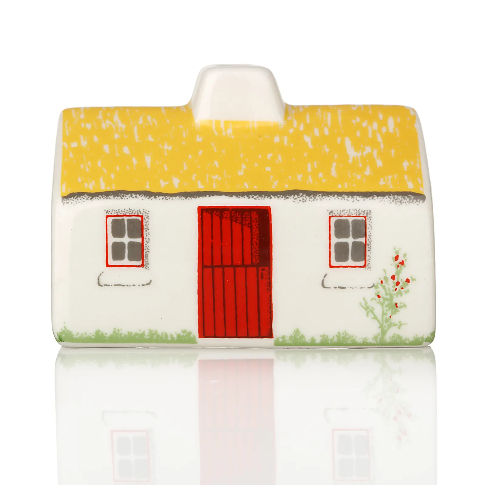 Handgefertigtes Irish Cottage aus Keramik mit Steinbrenner und 12 kleinen TorfsodenDieses handgefertigte Cottage ist eine Nachbildung eines traditionellen irischen Strohdachhauses. In Irland sagt man: ‚Zuhause ist da, wo der Herd brennt. Mit diesem kleinen, torfbefeuerten Cottage bringst du ein Stück Irland zu dir. Der irische Torf, der in diesem Set verwendet wird, wurde auf natürliche Weise zu Räucherwerk verarbeitet. Zünde den Torfsoden an, lege ihn auf den Stein und lass ihn glimmen. Während Rauch und Duft durch den Schornstein des Cottages ziehen, ist Irland bei dir, wo immer du auch bist. Material: Keramik Maße des Cottages: ca. 9×6×6 cm Stein-Brennteller 12 original irische Mini-Torfsoden Handgefertigtes Räucherset aus Irland