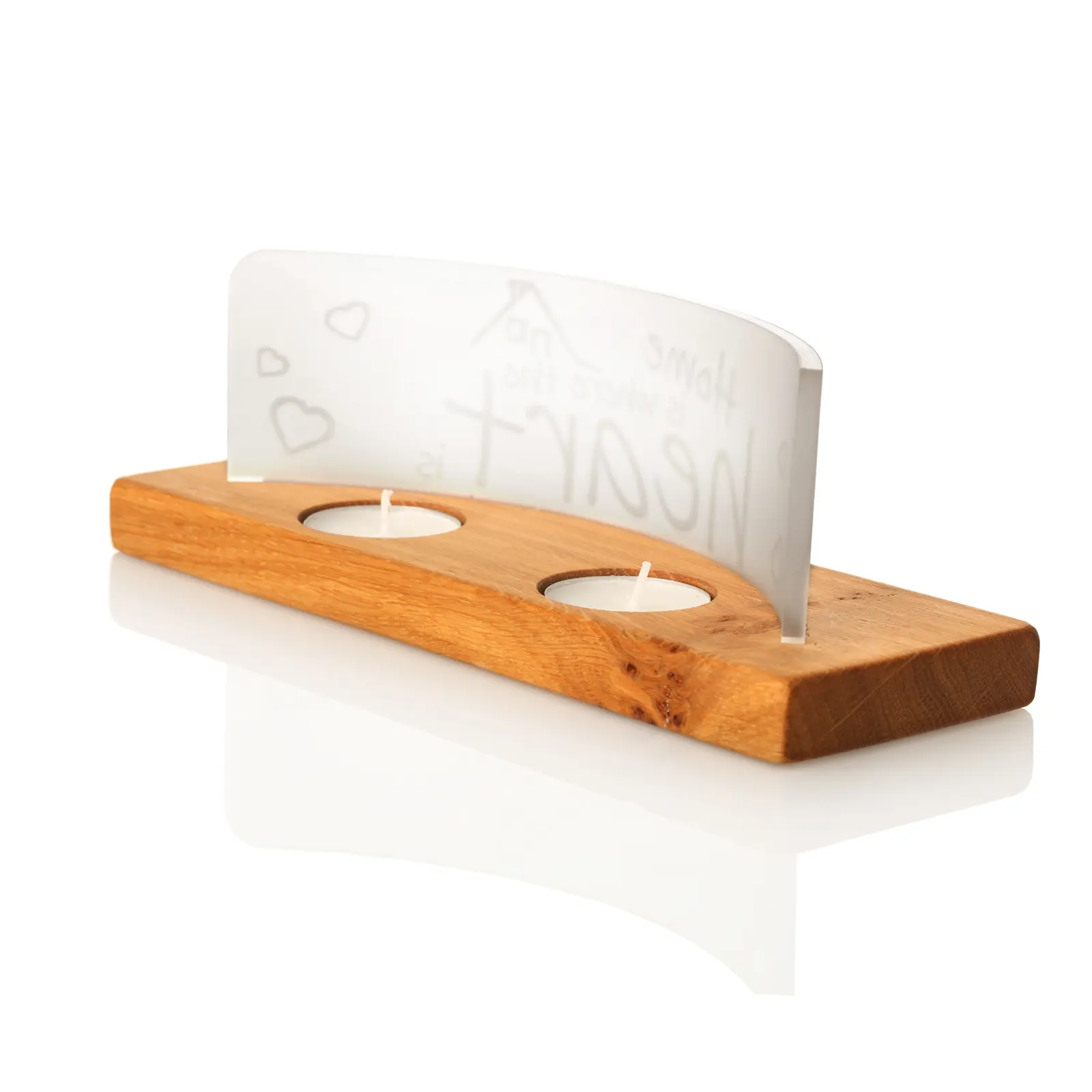Schottischer Teelichthalter aus recyceltem WhiskyfassDieser verspielte Teelichthalter aus der Crescent-Kollektion von LT Creations ist mit dem treffenden Spruch "Home is where the heart is" graviert Der massive Eichensockel wird aus einem wiederverwendeten schottischen Whiskyfass gefertigt. Das naturbelassene Holz verleiht jedem Teelichthalter seinen ganz besonderen Charme. Das gravierte Motiv ist in liebevoller Handarbeit ausgeführt und bringt herzliche Wärme in Dein Zuhause. Die stabile, halbmondförmige Scheibe aus satiniertem Echtglas streut das Licht des Teelichts sanft und erzeugt einen wundervoll warmen Schein. Maße: 25 x 8 x 8 cm Material: Eichenholz (recycelt), Echtglas Glasstärke: 5 mmHandgefertigt in Schottland Die Lieferung erfolgt in einem Geschenkkarton