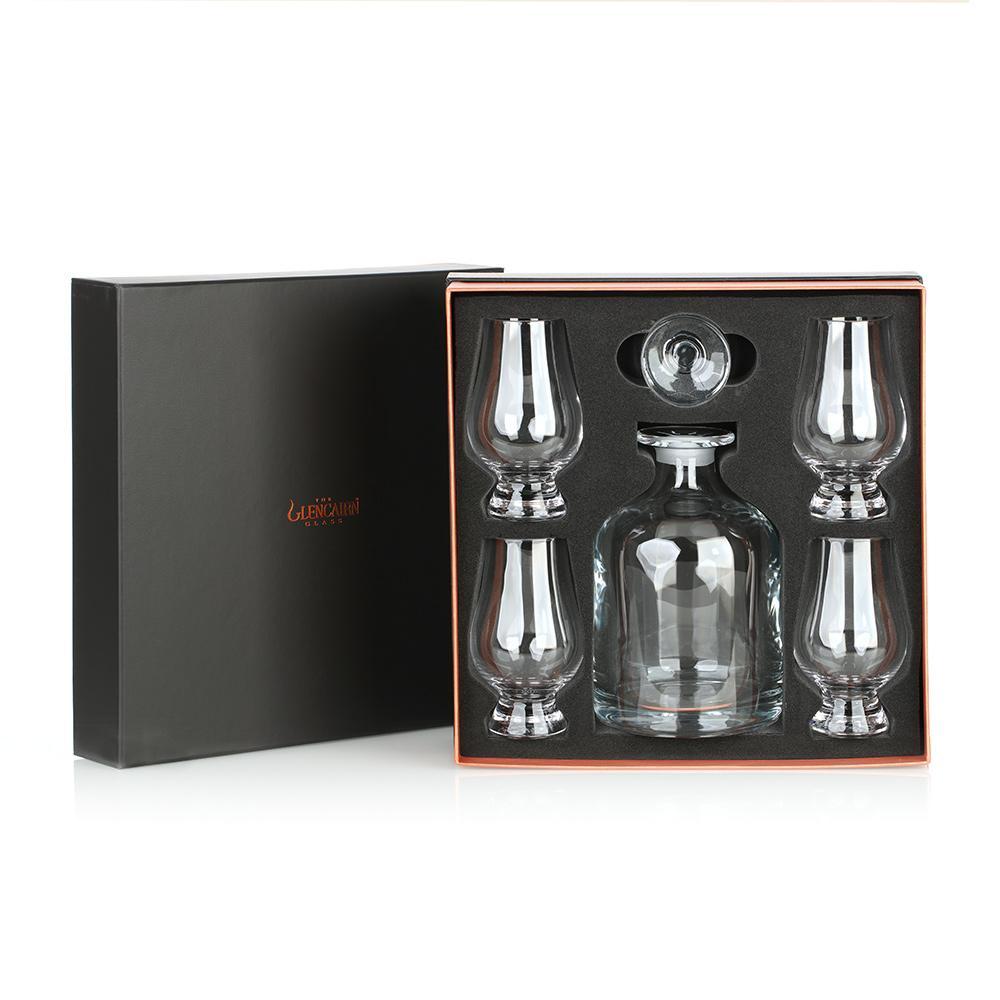 The Iona Decanter & vier Glencairn Tasting Gläser - handgefertigt in Schottland. Eine massive Karaffe aus Kristallglas zusammen mit vier Glencairn Tasting Gläsern bilden dieses edle Whisky Set.Der Dekanter ist dickwandig und schwer gearbeitet mit einem Fassungsvermögen von ca. 700 ml.Der Verschluss besteht ebenfalls aus massivem Kristallglas. Die berühmten Glencairn Tasting Gläser haben eine Höhe von ungefähr 115 mm und fassen, bis zum Rand befüllt, je ca. 175 ml.Ideal befüllt wird das Glencairn mit ungefähr 35 ml Whisky und auf Wunsch einem bisschen Wasser. Handgefertigt von Glencair Crystal in SchottlandDas originale Glencairn Logo ist im Fuß der Gläser eingraviert.Das Set wird in einer edlen Geschenkbox geliefert.