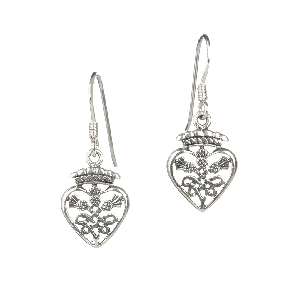 Filigrane schottische Disteln umrahmt von gekrönten Herzen und keltischen Ornamenten. Diese süßen Ohrhänger bestehen aus massivem Sterling Silber und werden von Hand in Schottland hergestellt.Sie sind jeweils ca. 12 x 15 mm groß und haben einen Aufhänger der ebenfalls aus Sterling Silber besteht.Die Lieferung erfolgt als Paar in einer hübschen Schmuckschatulle.