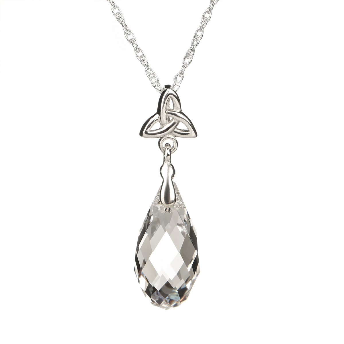 Keltische Trinity Knoten Kette mit Kristall – Sterlingsilber, handgefertigt in SchottlandFein gearbeiteter Trinity Knoten aus 925er Sterlingsilber, offen gestaltet und geschmückt mit einem tropfenförmigen Kristall. Die Form des Kristalls bringt Leichtigkeit ins Design, während der keltische Knoten für Verbindung und Unendlichkeit steht. Maße Anhänger:ca. 10 x 25 mm Länge der Kette: ca. 46 cmMaterial: 925er Sterlingsilber & Kristall Handgefertigt in SchottlandDie Lieferung erfolgt in einer edlen Schmuckbox